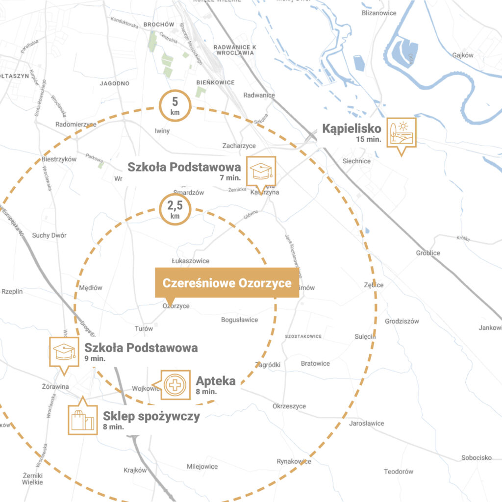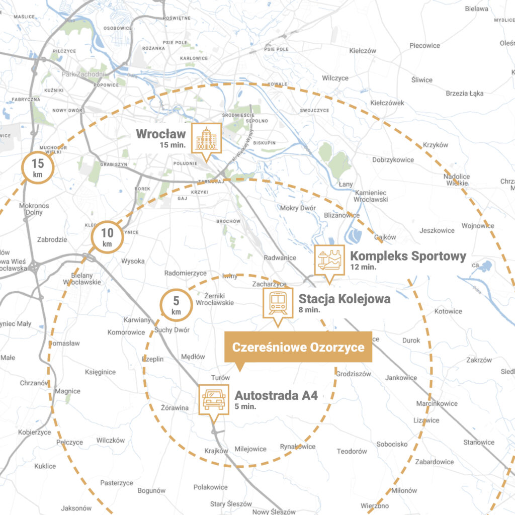 Kameralne osiedle znajduje się w Ozorzycach przy ul. Czereśniowej w gminie Siechnice. Lokalizacja ta jest świetnie skomunikowana z całym regionem. Zapewnia m.in. szybki dojazd do autostrady A4, którą w 15 minut możesz dotrzeć do Bielan Wrocławskich i do samego Wrocławia. Ponadto, tuż przy inwestycji znajduje się przystanek komunikacji szkolnej, a niedaleko także stacja kolejowa w Świętej Katarzynie. Infrastrukturę pobliskich miast masz więc na wyciągnięcie ręki.